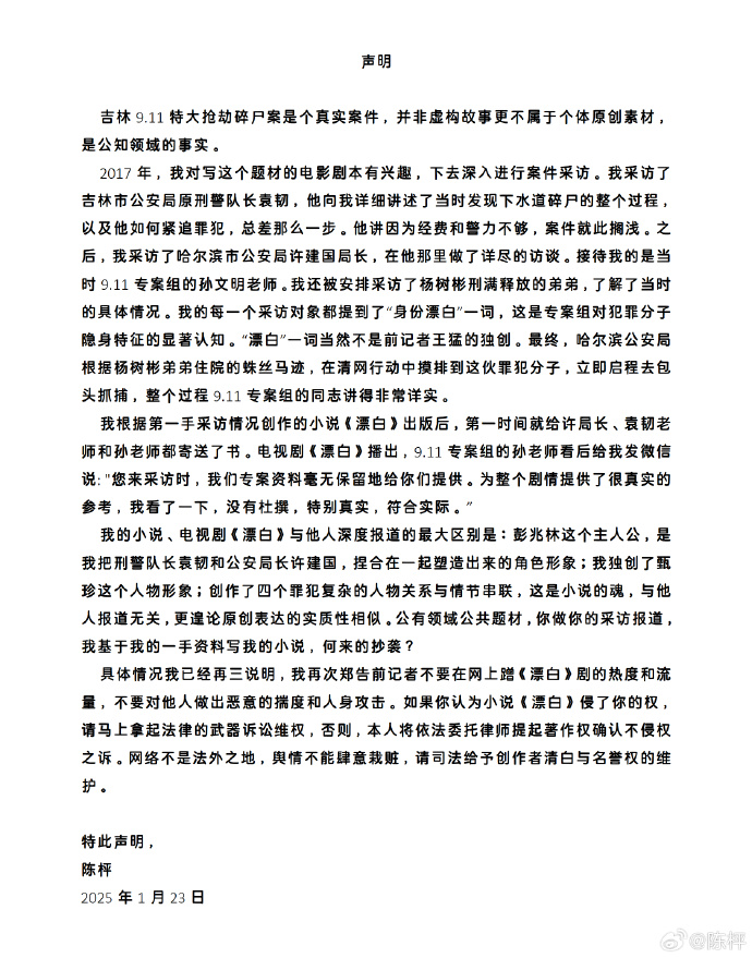 陈枰再发文警告前记者不要蹭热度。据新黄河,1月23日,《漂白》编剧陈枰再发博文回应抄袭。文中她写道:你做你的采访报道,我基于我的一手资料写我的小说,何来的抄袭?再次忠告前记者不要在网上蹭《漂白》的热度和流量。