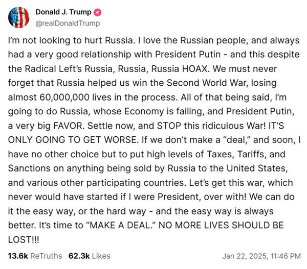 据界面新闻,当地时间1月22日,特朗普在自己的社交媒体平台发长文向俄罗斯喊话。