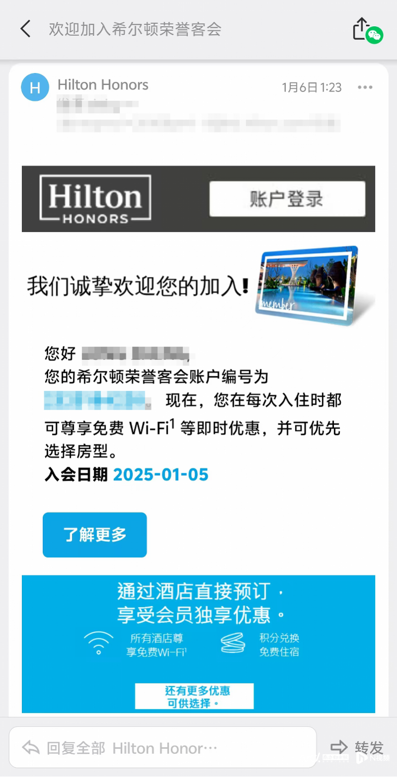 但李先生表示,其此前从未入住过希尔顿旗下酒店,也不认识邮件中提到的郑姓住客。而且,他并未点击邮件中的密码创建链接,但酒店仍发来会员注册成功邮件,担心其中存在个人信息泄露或邮箱安全问题。