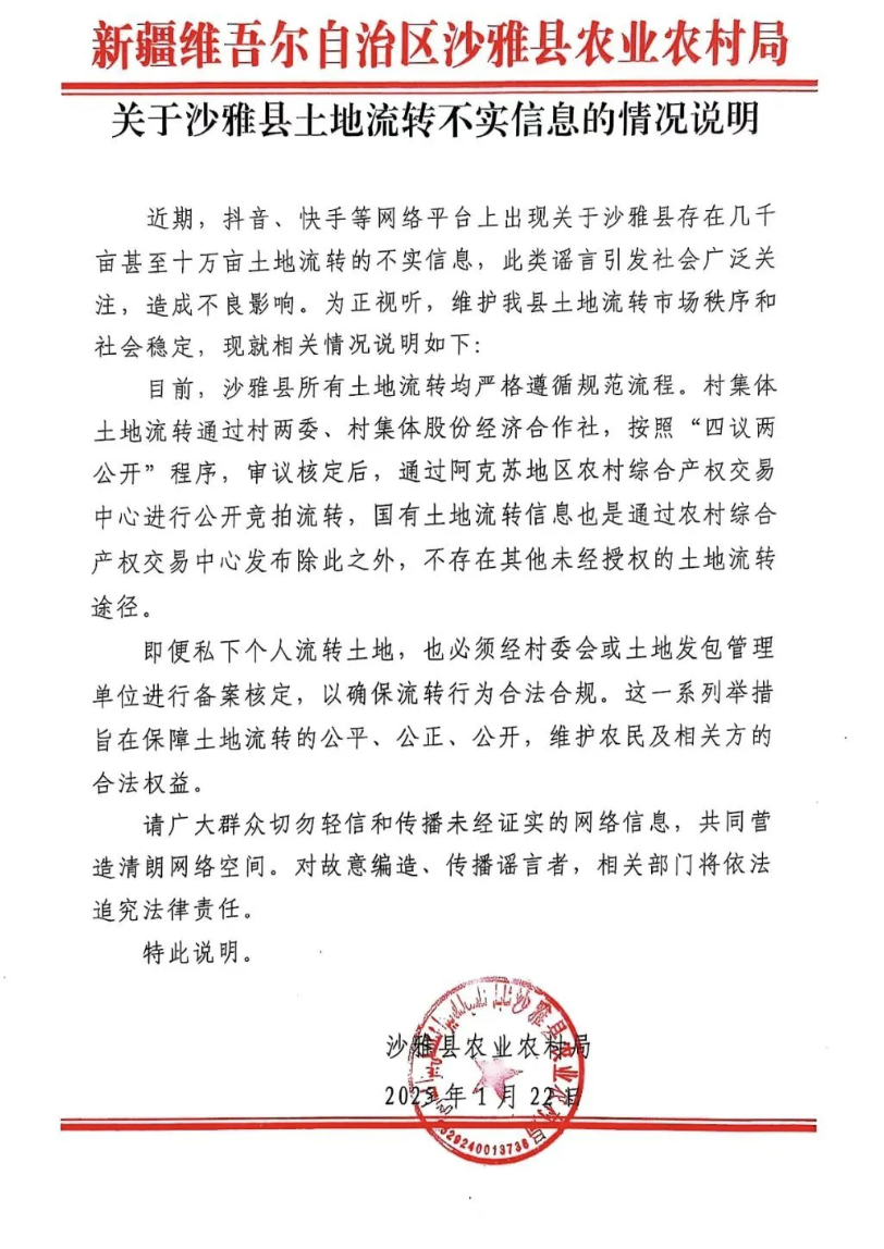 沙雅县农业农村局发布声明:该县所有土地流转均严格遵循规范流程办理。村集体土地流转通过村两委、村集体股份经济合作社审议核定后,通过阿克苏地区农村综合产权交易中心进行公开竞拍流转。国有土地流转信息也是通过农村综合产权交易中心发布,不存在其他未经授权的土地流转途径。私下个人流转土地,也必须经村委会或土地发包管理单位进行备案核定。此类十万亩土地流转为不实信息。