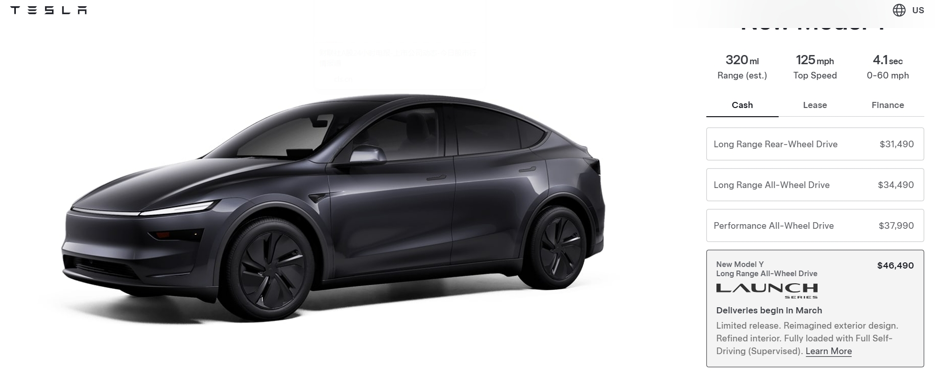 据第一财经,特斯拉在美国推出新款Model Y长续航全轮驱动版,起售价46490美元,3月份开始交付。