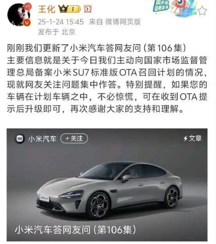 据新闻晨报综合消息,1月24日,小米汽车科技有限公司根据《缺陷汽车产品召回管理条例》和《缺陷汽车产品召回管理条例实施办法》的要求,向国家市场监督管理总局备案了召回计划。对此,小米集团公关部总经理王化表示,“主要信息就是关于今日我们主动向国家市场监督管理总局备案小米SU7标准版OTA召回计划的情况,如果您的车辆在计划车辆之中,可在收到OTA提示后升级即可。”