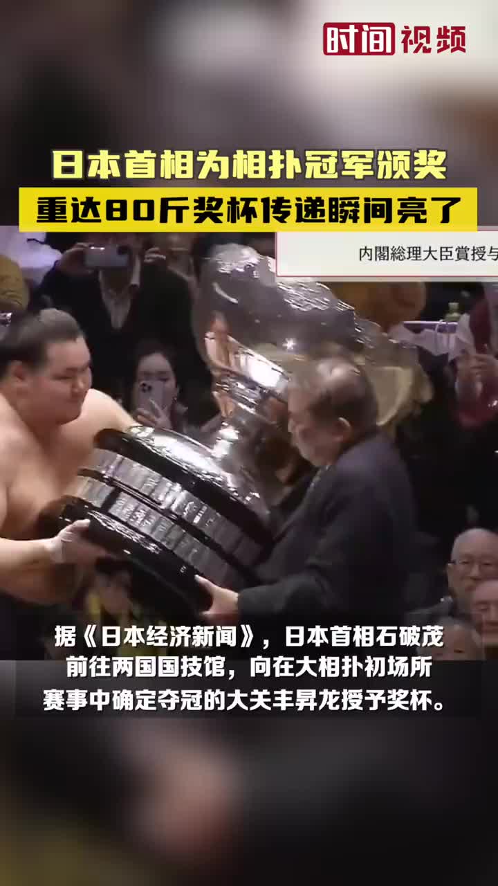 日本首相为相扑冠军颁奖:重达80斤奖杯传递瞬间亮了。