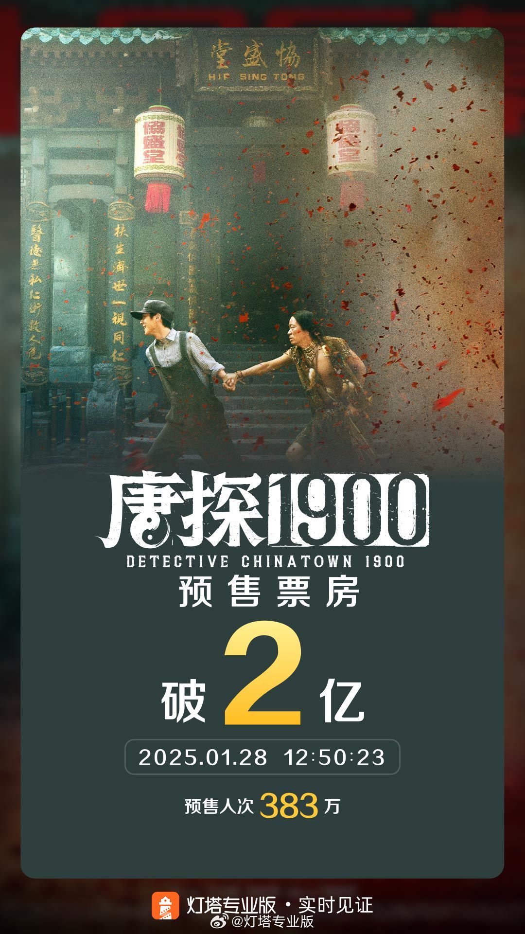 据灯塔专业版实时数据,截至1月28日12时50分,影片《唐探1900》预售总票房突破2亿。