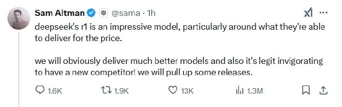 OpenAI首席执行官:DeepSeek-R1模型令人印象深刻,有新竞争对手加入令人振奋。