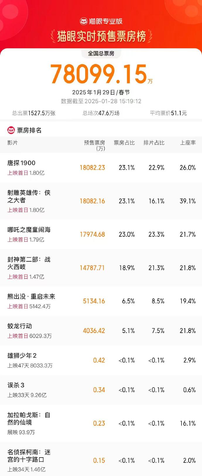 据猫眼专业版数据,截至1月28日15时19分,电影《唐探1900》大年初一预售票房超《射雕英雄传:侠之大者》,登顶2025大年初一预售票房榜。