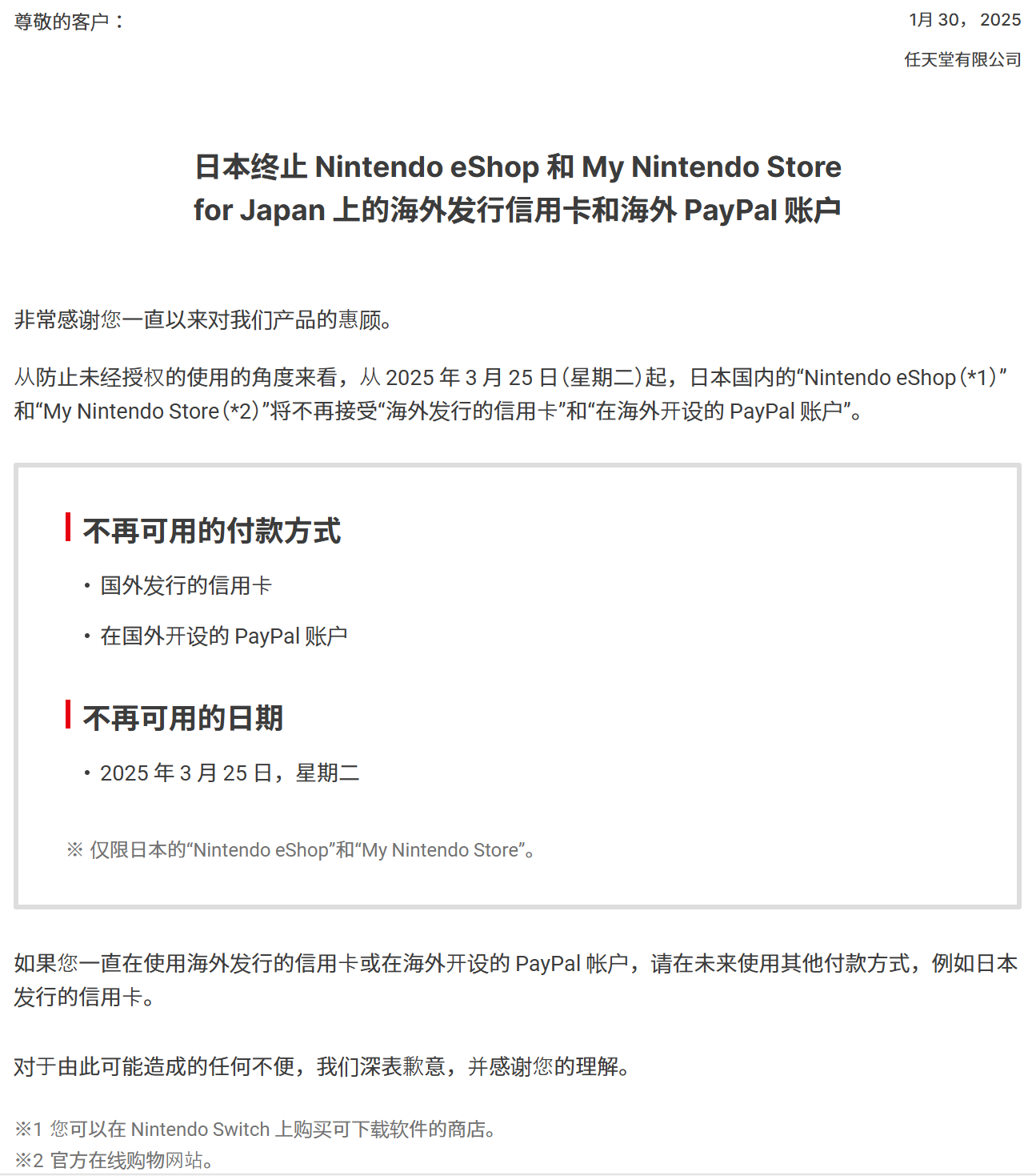 据潇湘晨报,1月30日,任天堂发布公告称,从3月25日开始,日服eShop以及日服My Nintendo Store将停止接受海外信用卡以及PayPal支付。目前使用非日本地区的信用卡以及PayPal的用户,今后需要使用日本发行的信用卡或其他支付方式。