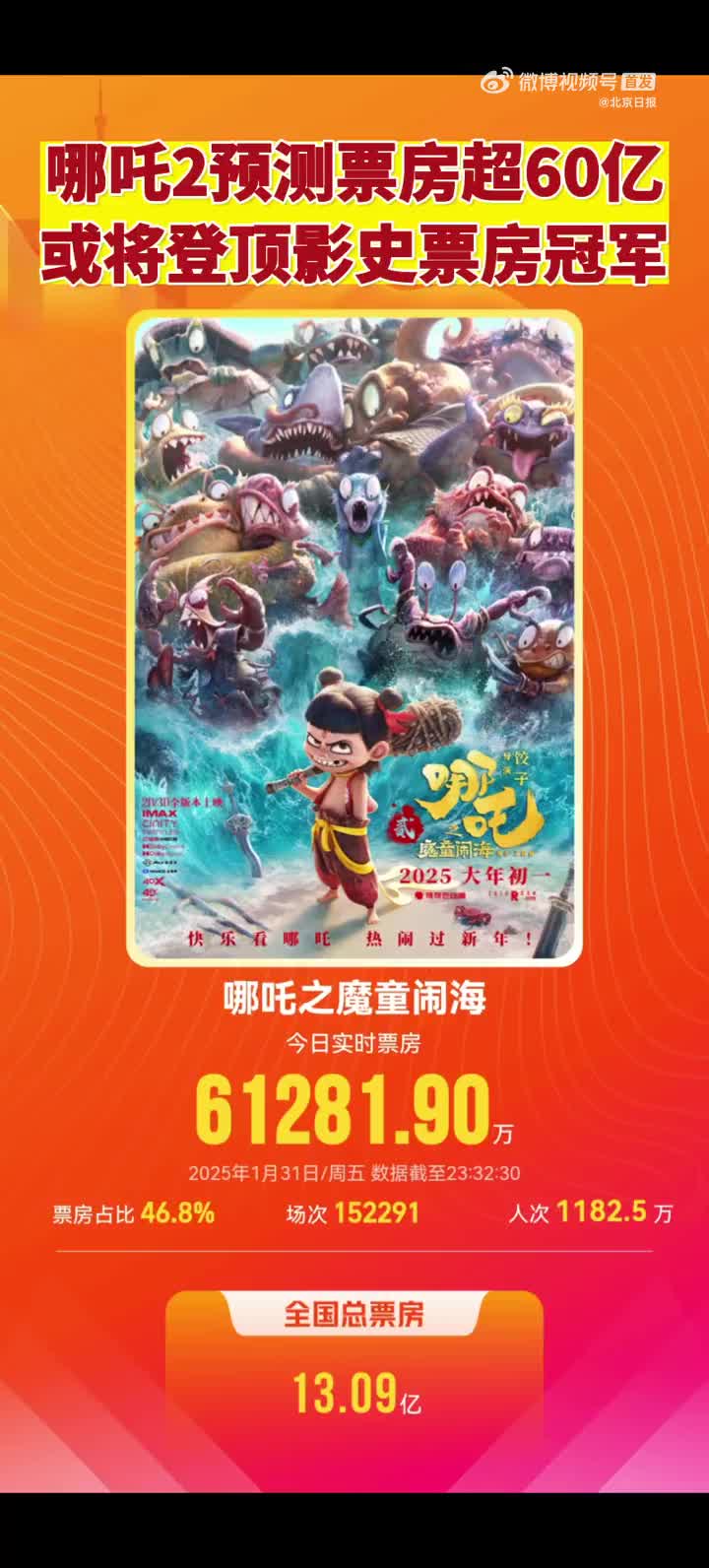 1月31日,电影《哪吒之魔童闹海》单日总票房超6.1亿元,这也是中国电影票房排行榜上第三部单日票房破6亿的影片,上映3天总票房超过18.5亿元。据灯塔专业版数据《哪吒之魔童闹海》最新预测总票房61.16亿元,猫眼专业版预测哪吒2总票房或超67.4亿,将大幅超过《长津湖》57.75亿元,成为影史首部票房破60亿元的电影。(via 北京日报)