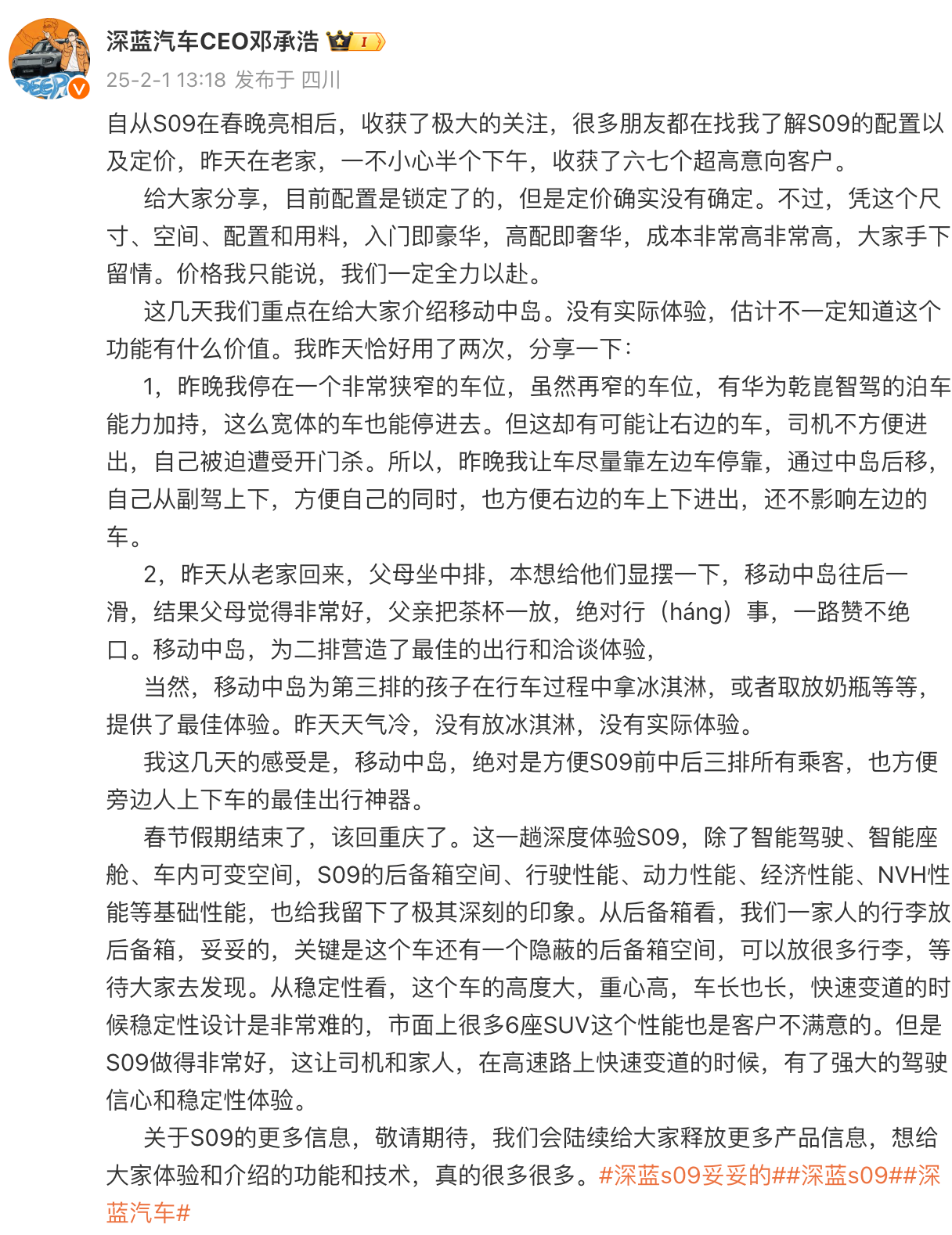 2月1日,深蓝汽车CEO邓承浩在微博发文透露,自从S09在春晚亮相后,“很多朋友都在找我了解S09的配置以及定价,昨天在老家,一不小心半个下午,收获了六七个超高意向客户”。邓承浩表示,目前配置是锁定了的,但是定价确实没有确定。据了解,去年底,深蓝S09车型曾陷抄袭风波,外观设计被质疑抄袭理想L9,彼时深蓝汽车官方予以否认,称该车的确是和理想L9、问界M9是同一级别,但拥有一套获得红点奖产品设计奖的家族化设计语言。