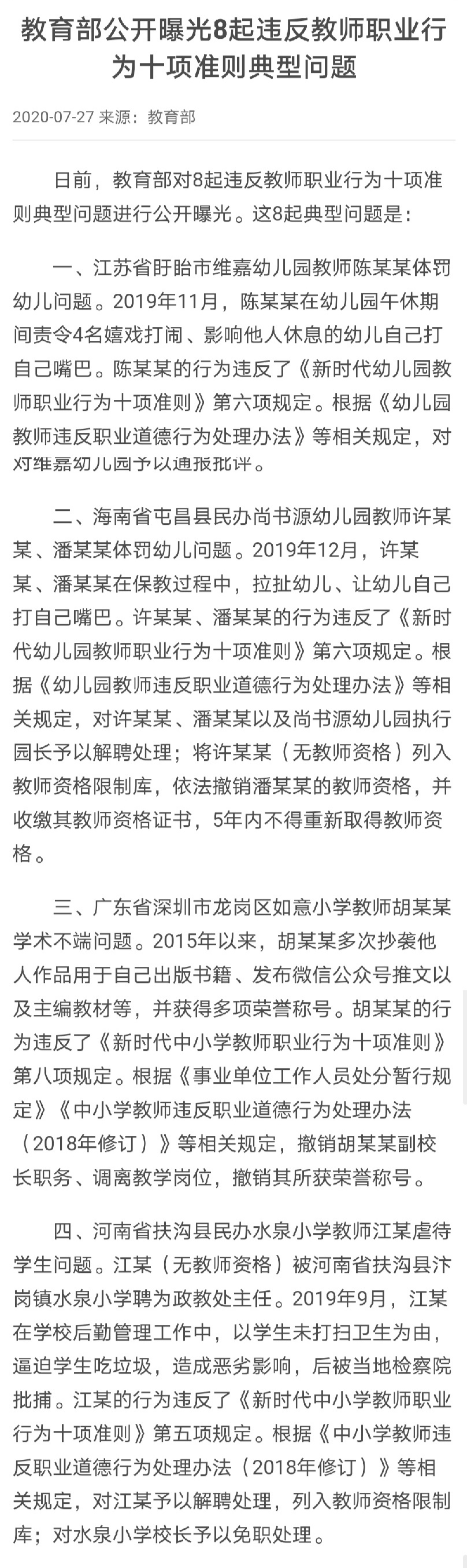 据教育部消息:日前,教育部对8起违反教师职业行为十项准则典型问题进行公开曝光,案例涉及体罚、性侵学生、学术不端、受贿等方面。其中,2018年至2019年期间,广西大湾镇中心小学教师肖某利用教导主任和教师身份便利,猥亵多名未成年女学生,被当地法院判处有期徒刑7年6个月。