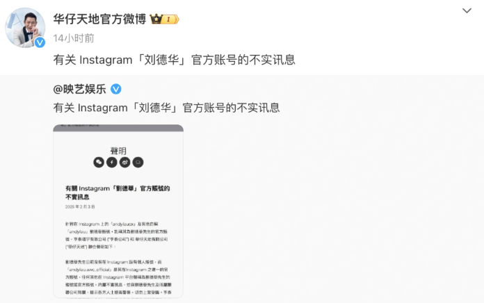 刘德华方辟谣ins账号发布动态悼念大S。据潇湘晨报,2月3日,刘德华公司发声明否认ins账号出自艺人本人及所属公司,刘德华在instagram不存在个人账号。此前网传刘德华ins账号发文悼念大S,照片是两人合作电影《未来警察》。