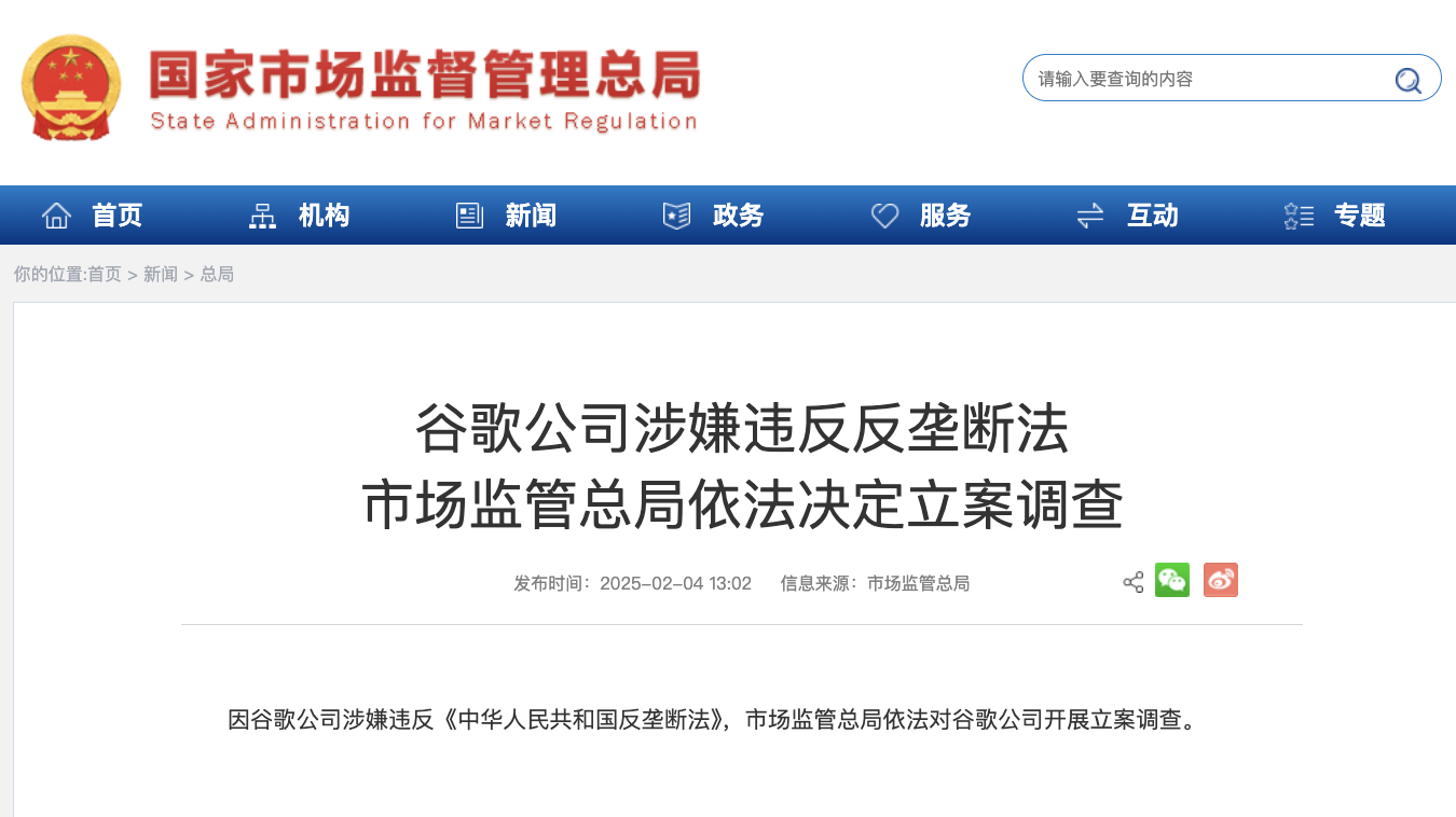 2月4日,据国家市场监督管理总局消息,因谷歌公司涉嫌违反《中华人民共和国反垄断法》,市场监管总局依法对谷歌公司开展立案调查。 ​​​