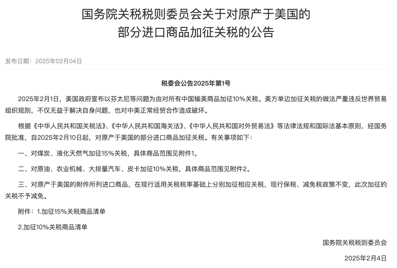 据财政部消息,经国务院批准,自2025年2月10日起,对原产于美国的部分进口商品加征关税。对煤炭、液化天然气加征15%关税,对原油、农业机械、大排量汽车、皮卡加征10%关税。