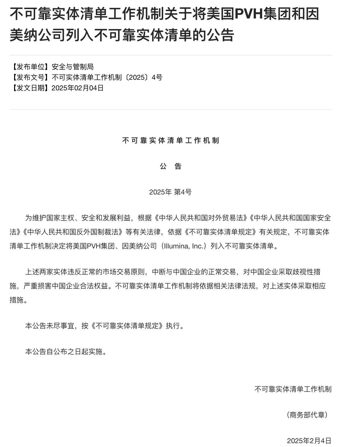 2月4日,商务部发布《不可靠实体清单工作机制关于将美国PVH集团和因美纳公司列入不可靠实体清单的公告》。为维护国家主权、安全和发展利益,根据《中华人民共和国对外贸易法》《中华人民共和国国家安全法》《中华人民共和国反外国制裁法》等有关法律,依据《不可靠实体清单规定》有关规定,不可靠实体清单工作机制决定将美国PVH集团、因美纳公司(Illumina, Inc.)列入不可靠实体清单。