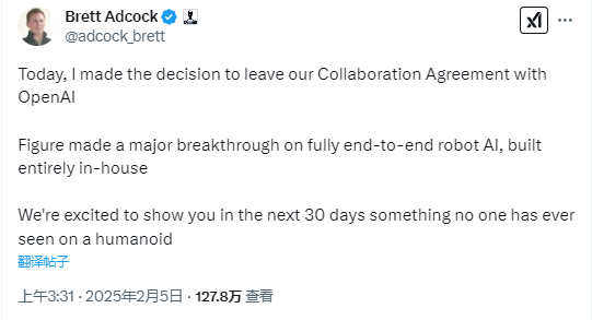 据每日经济新闻,北京时间2月5日(周三)早间,去年曾火爆“出圈”、致力于将通用人形机器人引入商业和住宅用途的机器人公司Figure AI宣布,由于已经取得“重大突破”,公司将终止与OpenAI的合作,转而专注于内部人工智能的研发。虽然在社交媒体X上,Figure AI创始人兼CEO Brett Adcock对具体的细节守口如瓶,但他承诺在未来30天内向外界提供“从未在人形机器人上见过的东西”。