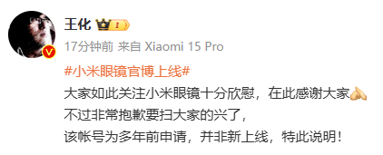 王化回应小米眼镜官博上线:帐号为多年前申请,并非新上线。