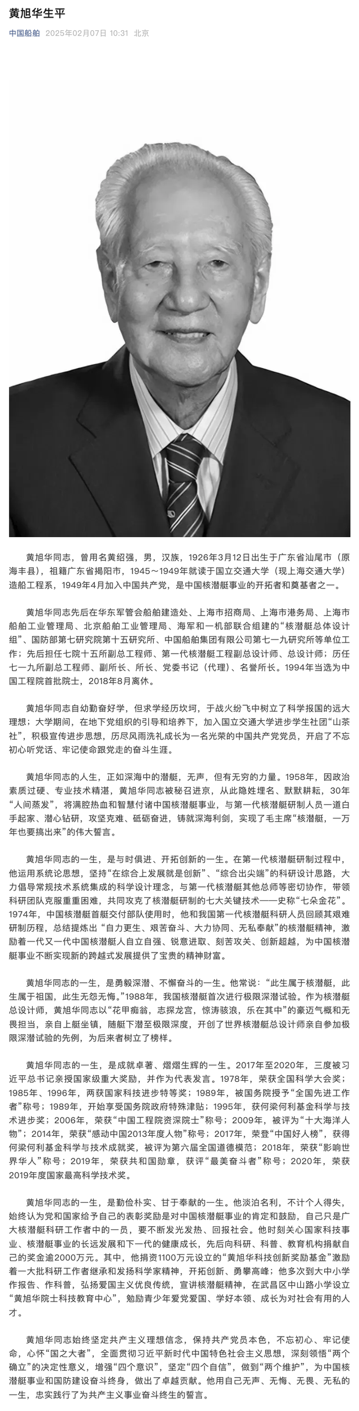 中国共产党优秀党员,中国工程院院士,共和国勋章、国家最高科学技术奖获得者,全国道德模范,中国第一代核潜艇工程总设计师,中国船舶集团有限公司第七一九研究所原所长、党委书记(代理)、名誉所长黄旭华同志,因病医治无效,于2025年2月6日20时30分在湖北武汉逝世,享年99岁。