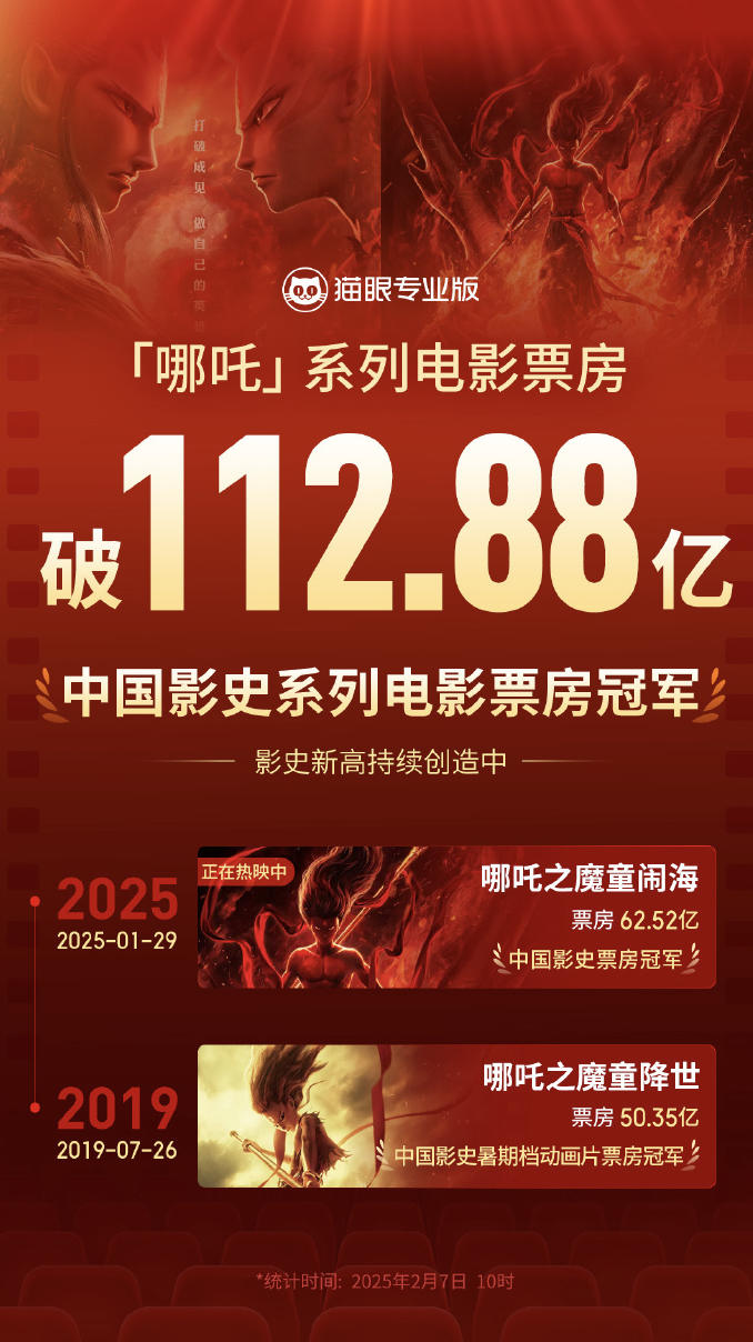据猫眼专业版数据,截至2月7日10时,《哪吒之魔童闹海》累计票房突破62.52亿元,助哪吒系列电影总票房超唐探系列电影成绩,成中国影史系列电影票房冠军。