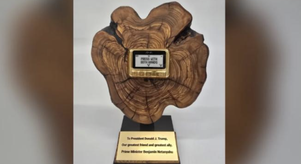 据《以色列时报》报道,以色列总理办公室证实,内塔尼亚胡4日与特朗普会面时,赠送了一台金色寻呼机作为礼物。