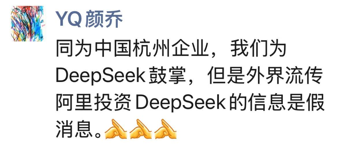 据财联社,针对今日阿里投资DeepSeek传闻,阿里公关负责人对此予以否认。该负责人称,同为中国杭州企业,我们为DeepSeek鼓掌,但是外界流传阿里投资DeepSeek的信息是假消息。