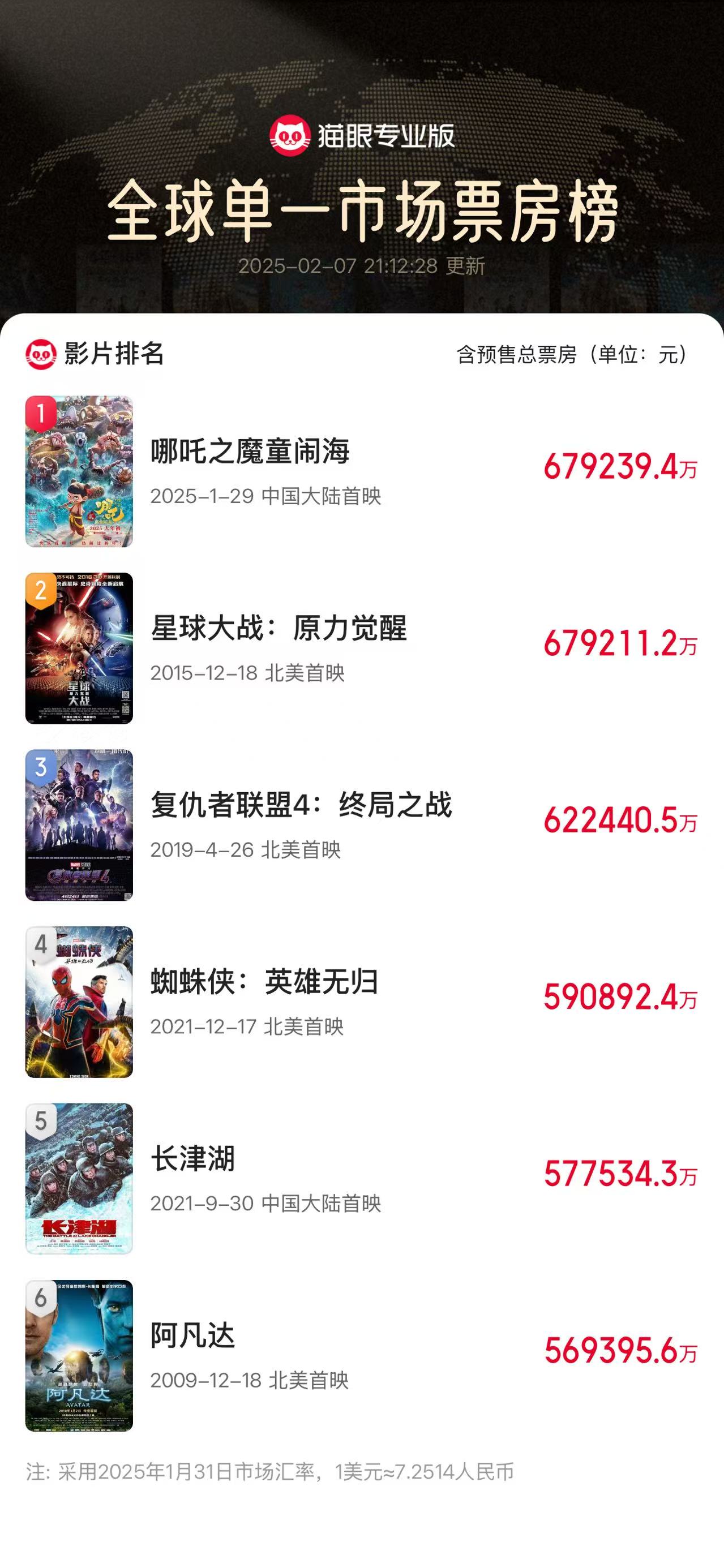 《哪吒之魔童闹海》登顶全球影史单一市场票房榜。