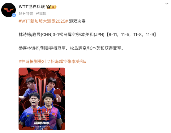 2月7日,WTT新加坡大满贯2025混双决赛举行。据WTT世界乒联微博消息,林诗栋/蒯曼夺得冠军,松岛辉空/张本美和获得亚军。