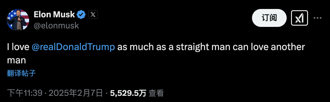 2月8日消息,马斯克在X平台发文“表白”特朗普,“我爱特朗普,就像一个直男爱上另一个男人一样。”