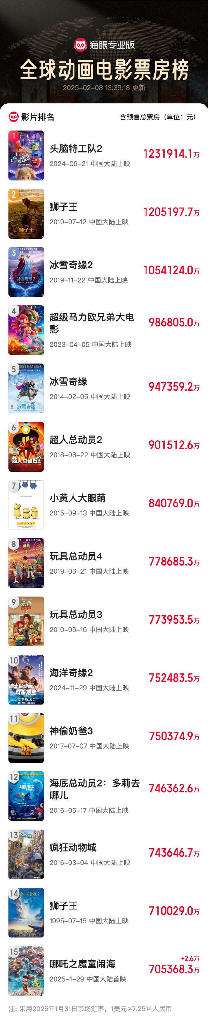 《哪吒之魔童闹海》进入全球动画电影票房榜前15。
