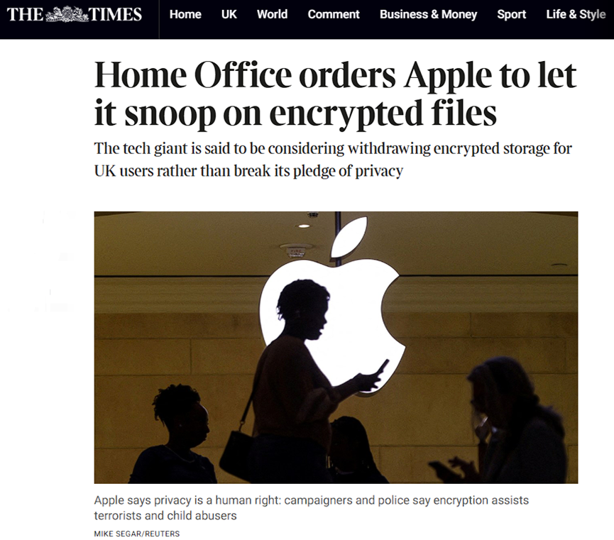 据环球时报援引美国《华盛顿邮报》报道称,英国安全官员已经秘密下令,要求美国苹果公司“开后门”,允许英国政府获取苹果用户上传至其云存储的所有内容。