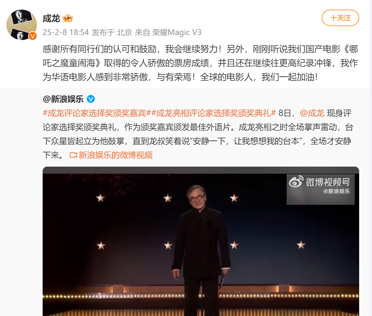 据九派新闻,2月8日,成龙在社交媒体平台发文:“刚刚听说我们国产电影《哪吒之魔童闹海》取得的令人骄傲的票房成绩,并且还在继续往更高纪录冲锋,我作为华语电影人感到非常骄傲,与有荣焉!全球的电影人,我们一起加油!”