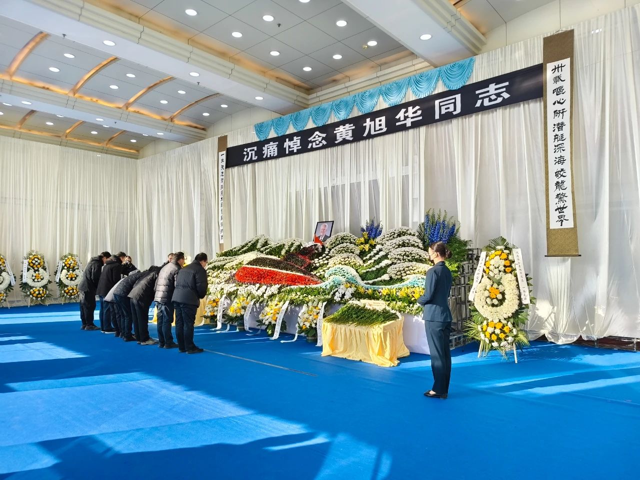 两边挽联上写着,“卅载呕心研潜艇深海蛟龙惊世界,一生矢志卫海疆大国重器铸功勋。”