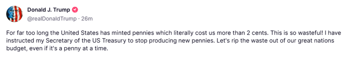 特朗普:已指示财政部停产一美分硬币。
