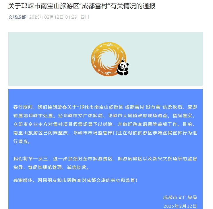 据大皖新闻2月12日凌晨,四川成都市文化广电旅游局发布关于邛崃市南宝山旅游区“成都雪村”有关情况的通报。