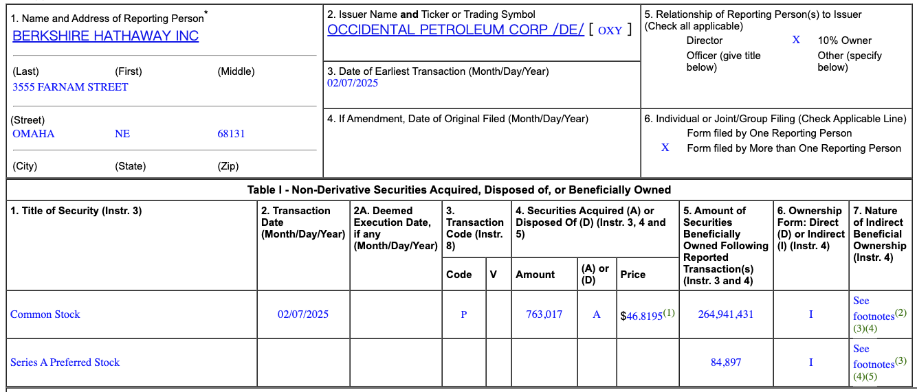据界面,当地时间2月11日,西方石油在美国证券交易委员会(SEC)提交的文件中披露,巴菲特旗下伯克希尔·哈撒韦于2月7日以每股约46.8美元的价格买入763,017股西方石油普通股股票,共计斥资约3572.4万美元。至此,伯克希尔对西方石油普通股的持股数量达到约2.65亿股。