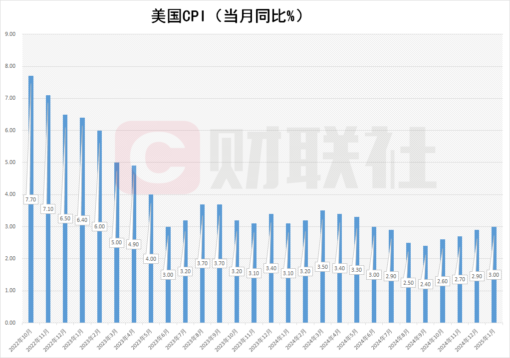 据财联社,美国1月CPI同比增长3%,预估为增长2.9%,前值为增长2.9%;1月CPI环比增长0.5%,预估为增长0.3%,前值为增长0.4%。