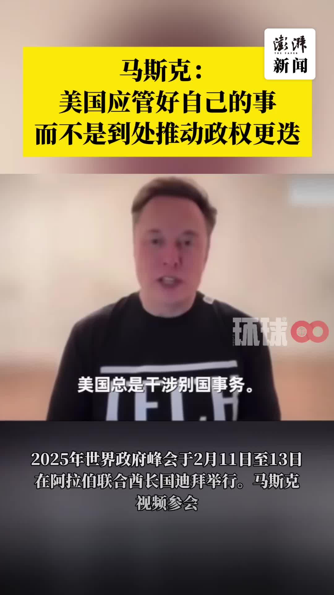 当地时间2月13日,美国企业家马斯克表示,美国很多时候在国际事务中有点咄咄逼人,应管好自己的事,而不是到处推动政权更迭。(via 澎湃新闻)