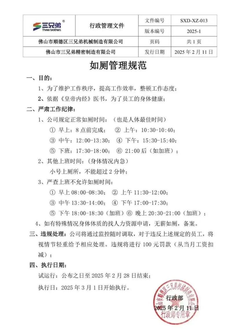 据羊城晚报,近日,一份名为《如厕管理规范》的文件在网上流传,文件上标明的发布者为佛山市顺德区三兄弟机械制造有限公司,发布时间为2月11日。