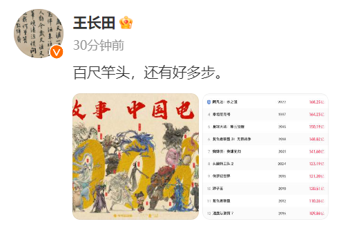 据界面,《哪吒之魔童闹海》总票房突破百亿元。14日,光线传媒董事长王长田发文回应:“百尺竿头,还有好多步。”