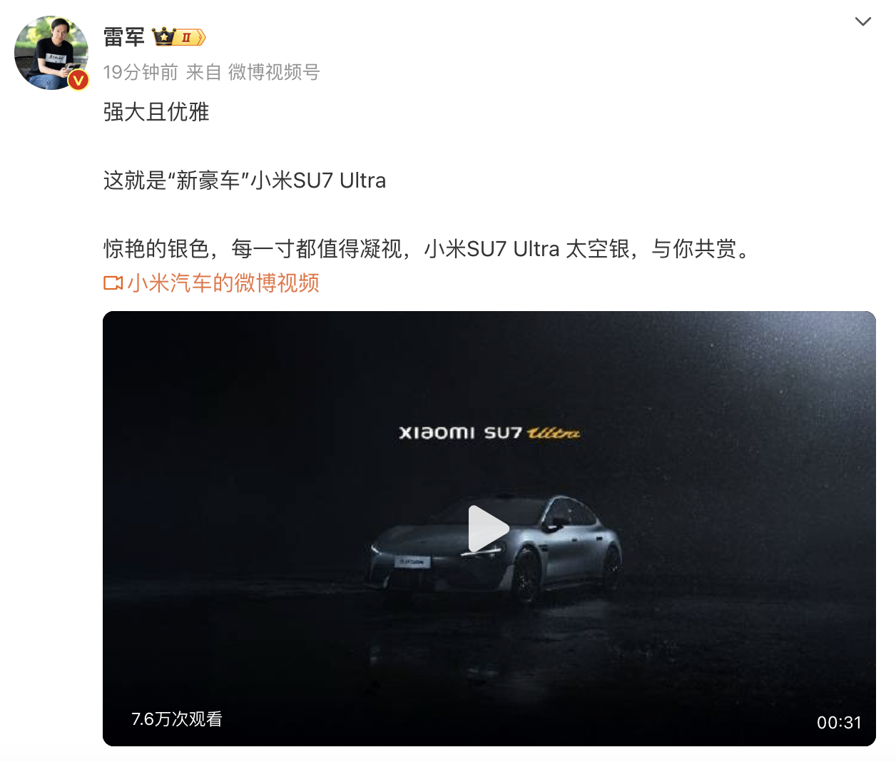 据九派新闻,2月14日,@小米汽车官宣SU7 Ultra新配色“太空银”并配文:“强大且优雅,这就是‘新豪车’小米SU7 Ultra。惊艳的银色,每一寸都值得凝视。”