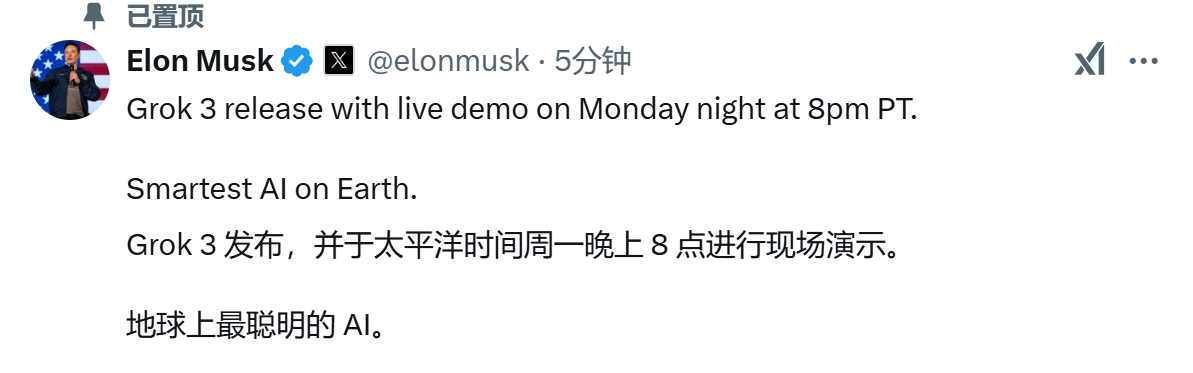 比DeepSeek更强?Grok 3即将发布,马斯克曾称其将超越所有公开发布的模型。
