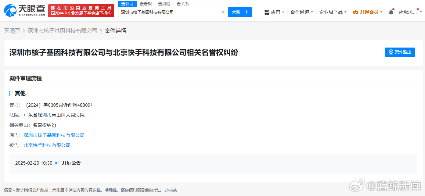 据蓝鲸新闻,天眼查司法案件信息显示,近日,深圳市核子基因科技有限公司新增一条开庭公告,案由为名誉权纠纷,被告为北京快手科技有限公司,该案将于2月20日在广东省深圳市南山区人民法院开庭审理。此前,该公司还曾因名誉权纠纷起诉百度在线网络技术(北京)有限公司、北京百度网讯科技有限公司。