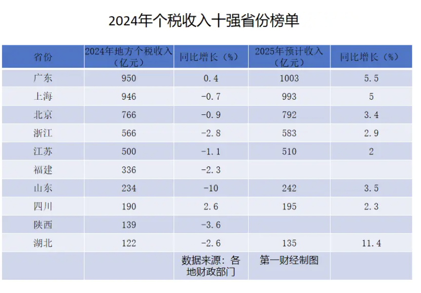 2024年广东个税收入以约950亿元,反超上海重夺榜首。而上海则以946亿元紧随其后,稳居第二。北京继续位列第三。浙江、江苏、福建、山东分列第四至第七。个税收入前七名均来自东部发达地区。四川、陕西和湖北个税收入均超百亿,分列第八至第十位。