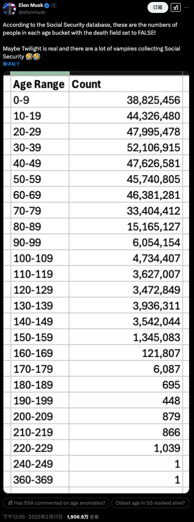 当然,为何美国政府官方的社保数据库会有大量出生年月不明的人士,以及总人数的混乱,就得等马斯克后续的更新了。