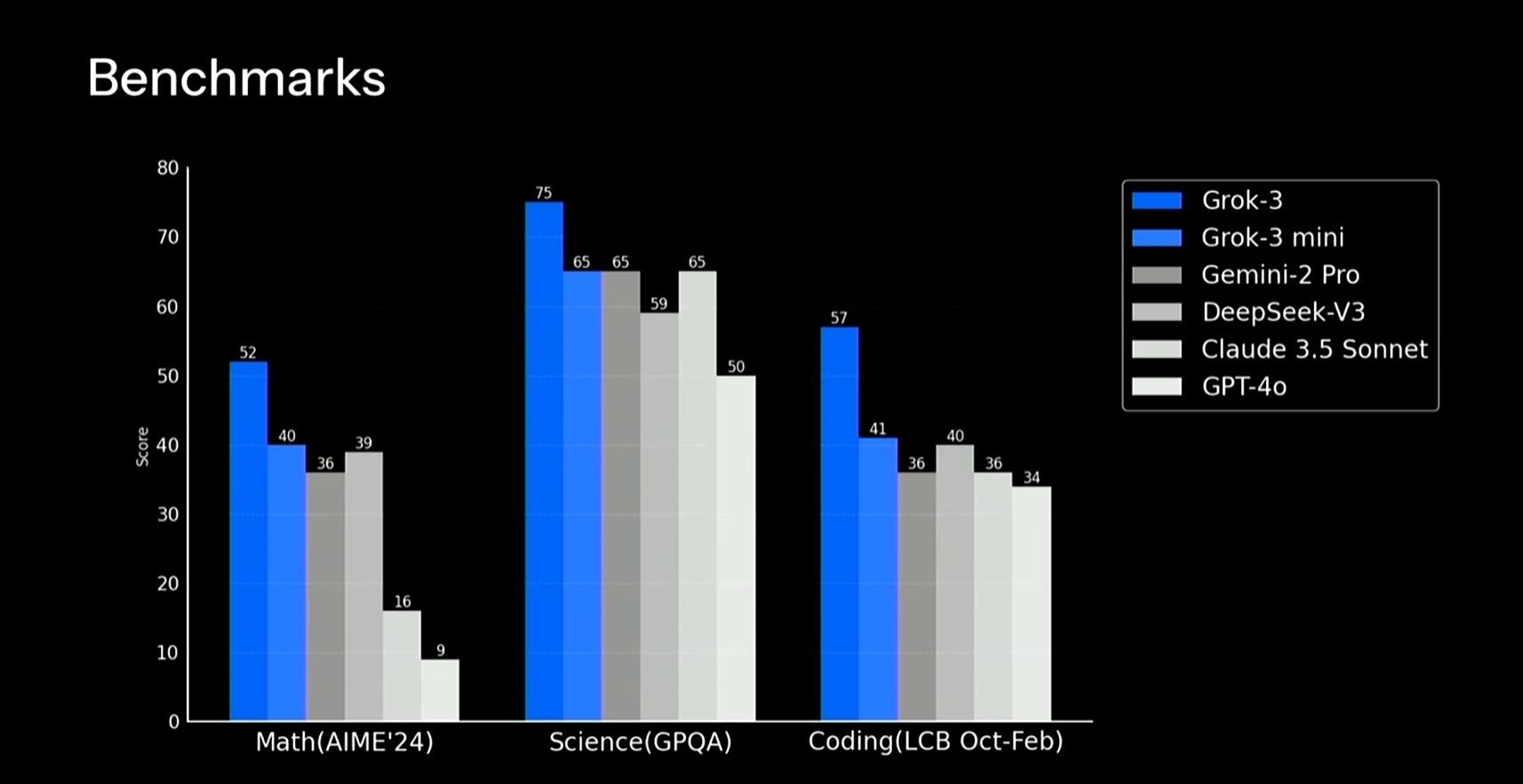 Grok-3和Grok-3 mini在多方面的测试得分上都超过或媲美Gemini、DeepSeek和ChatGPT等对手。xAI工程师介绍,虽然Grok起步较晚,但在MMLU得分上以超快地速度追上了ChatGPT。