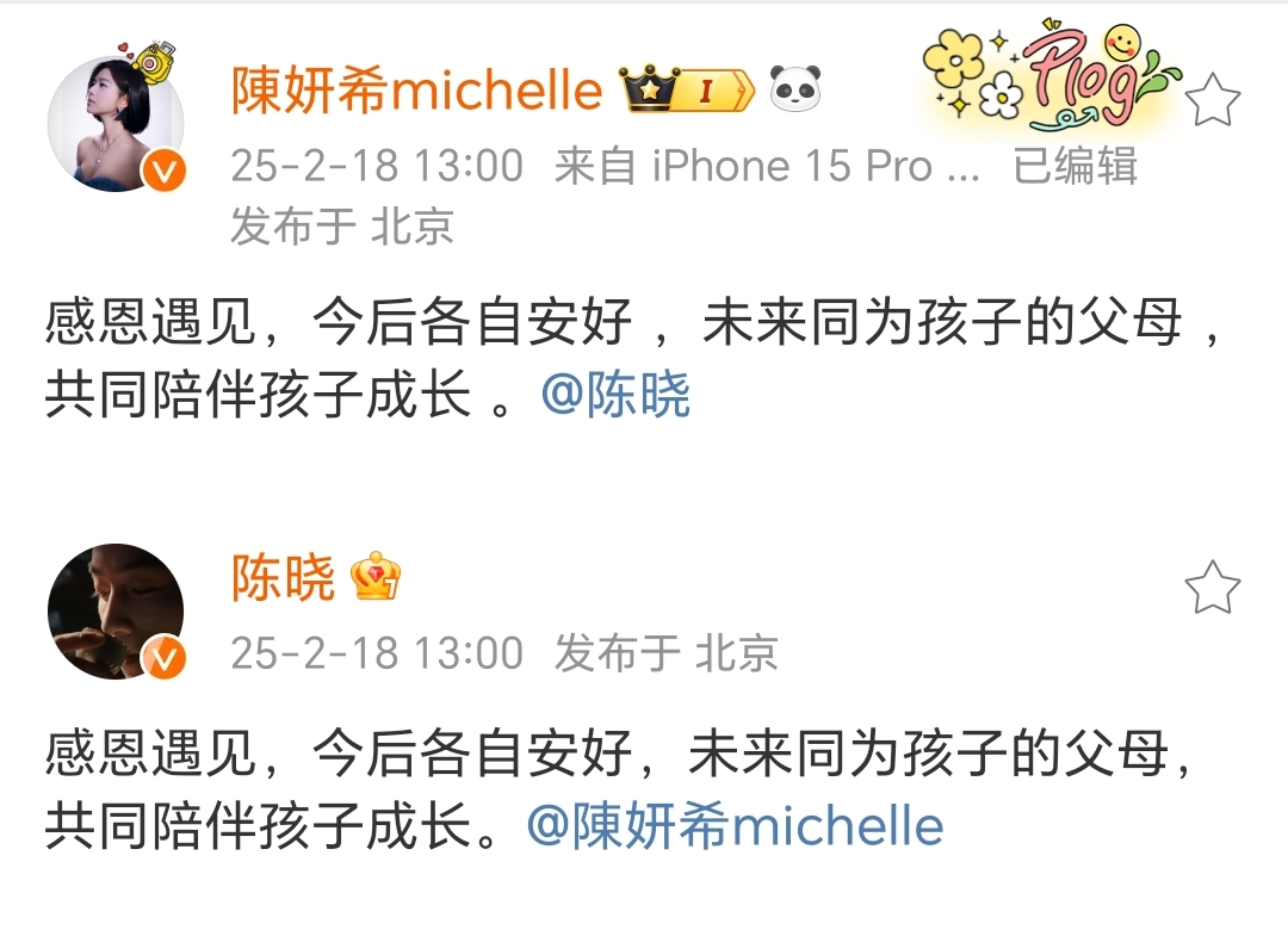 据红星新闻,2月18日,演员陈晓、陈妍希通过微博官宣离婚,他们发出共同的文字表示:“感恩遇见,今后各自安好,未来同为孩子的父母,共同陪伴孩子成长。”