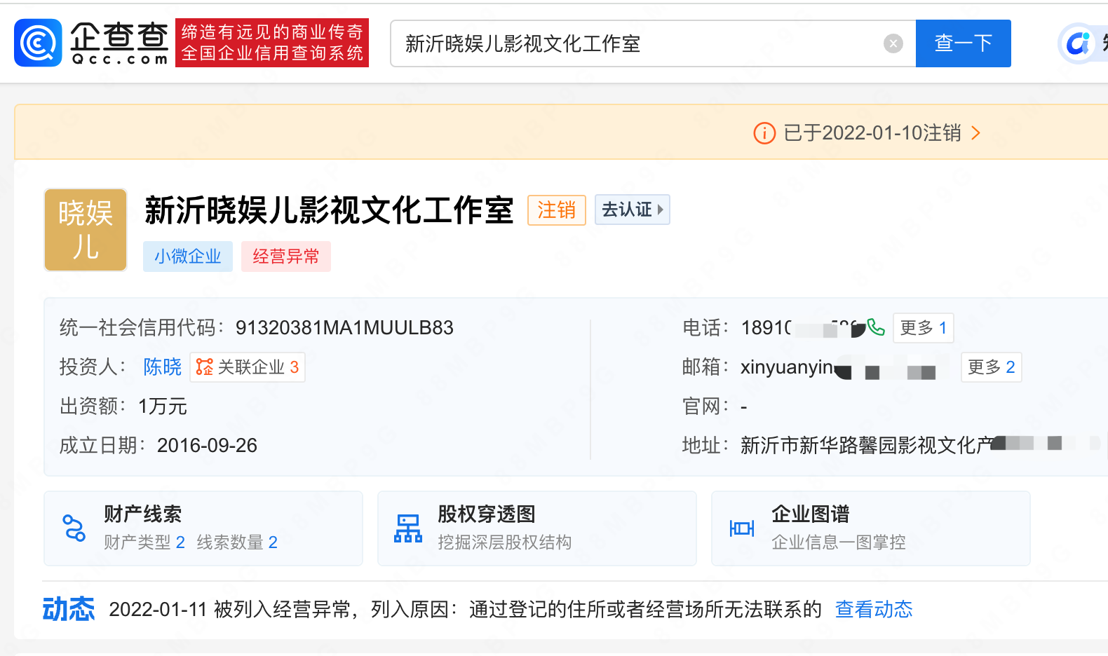 2月18日,演员陈晓和陈妍希发相同文案宣布离婚。企查查显示,目前,陈晓名下共关联3家工作室,包括无锡晓晓星影视工作室、上海陈晓影视文化工作室、新沂晓娱儿影视文化工作室。其中,后两家工作室已分别于2020年、2022年注销。目前为存续状态的无锡晓晓星影视工作室成立于2018年5月,出资额50万人民币,经营范围含电影的制作、发行与放映,广播电视节目的制作,电影剧本创作,影视服装、器材的租赁,组织文化艺术交流活动等,为陈晓个人独资企业。