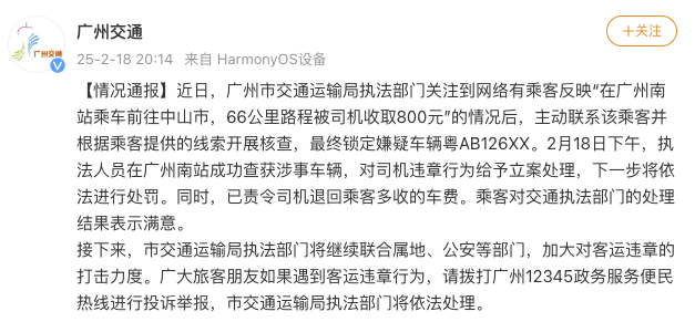 2月18日,广州交通运输局通报,近日,广州市交通运输局执法部门关注到网络有乘客反映“在广州南站乘车前往中山市,66公里路程被司机收取800元”的情况后,主动联系该乘客并根据乘客提供的线索开展核查,最终锁定嫌疑车辆粤AB126XX。2月18日下午,执法人员在广州南站成功查获涉事车辆,对司机违章行为给予立案处理,下一步将依法进行处罚。同时,已责令司机退回乘客多收的车费。乘客对交通执法部门的处理结果表示满意。接下来,市交通运输局执法部门将继续联合属地、公安等部门,加大对客运违章的打击力度。