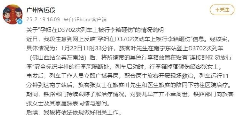 2月19日,广州客运段发布关于“孕妇在D3702次列车上被行李箱砸伤”的情况说明称,经核实,具体情况为:1月22日11时33分许,旅客叶先生在南宁东站登上D3702次列车(佛山西站至崇左南站)后,将所携带的黑色行李箱放置在贴有“连接部位 勿放行李”安全标识字样的行李架隔断处,列车启动时,行李箱掉落砸伤旅客张女士。事发后,列车工作人员立即广播寻医,配合医生旅客开展现场救治。列车运行11分钟到达南宁站后,旅客张女士在旅客叶先生和医生旅客的陪同下前往医院治疗。期间,铁路部门持续跟踪了解治疗情况。对婴儿早产并不幸离世,铁路部门向旅客张女士及其家属深表同情与慰问。广州客运段表示,后续将依法依规做好相关工作。