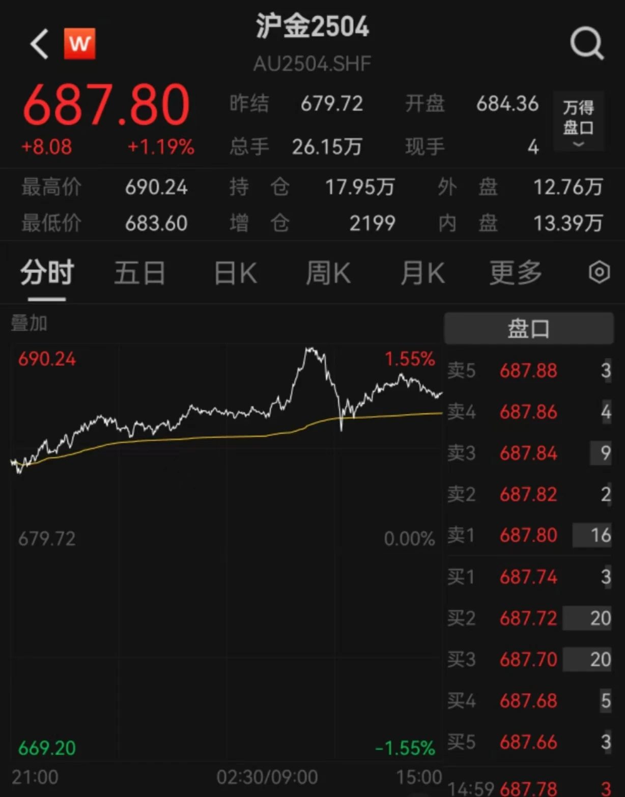 据Wind数据,2月19日,沪金期货主力合约走高,盘中最高升至690.24元/克,逼近日前所创691.76元/克的历史高点。截至收盘,沪金期货主力合约报687.80元/克,上涨1.19%。