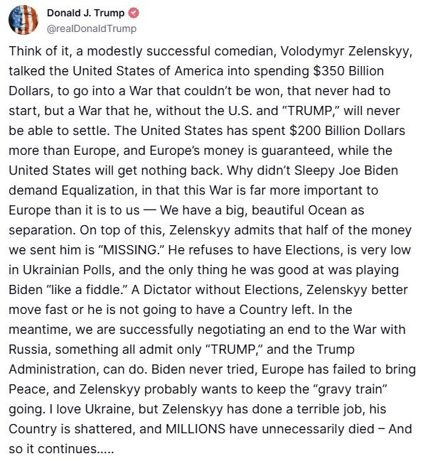当地时间周三,特朗普在Truth Social发文称,这位乌克兰领导人是一个“小有成就的喜剧演员”,他实际上是在欺骗美国,让美国为了一场不可能赢、本不应该开始的战争花费了数千亿美元。